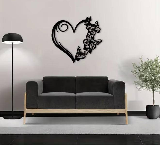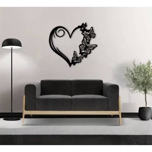 Dodáte svému interiéru eleganci a romantickou atmosféru díky této jemně zpracované kovové dekoraci ve tvaru srdce zdobeného motýly. Precizní laserový výřez vytváří působivý a lehký design, který na zdi působí téměř jako kresba – čistě, moderně a přitom s nádechem něžnosti.